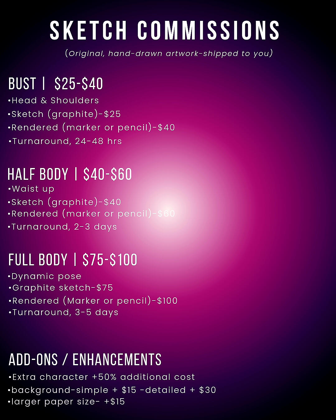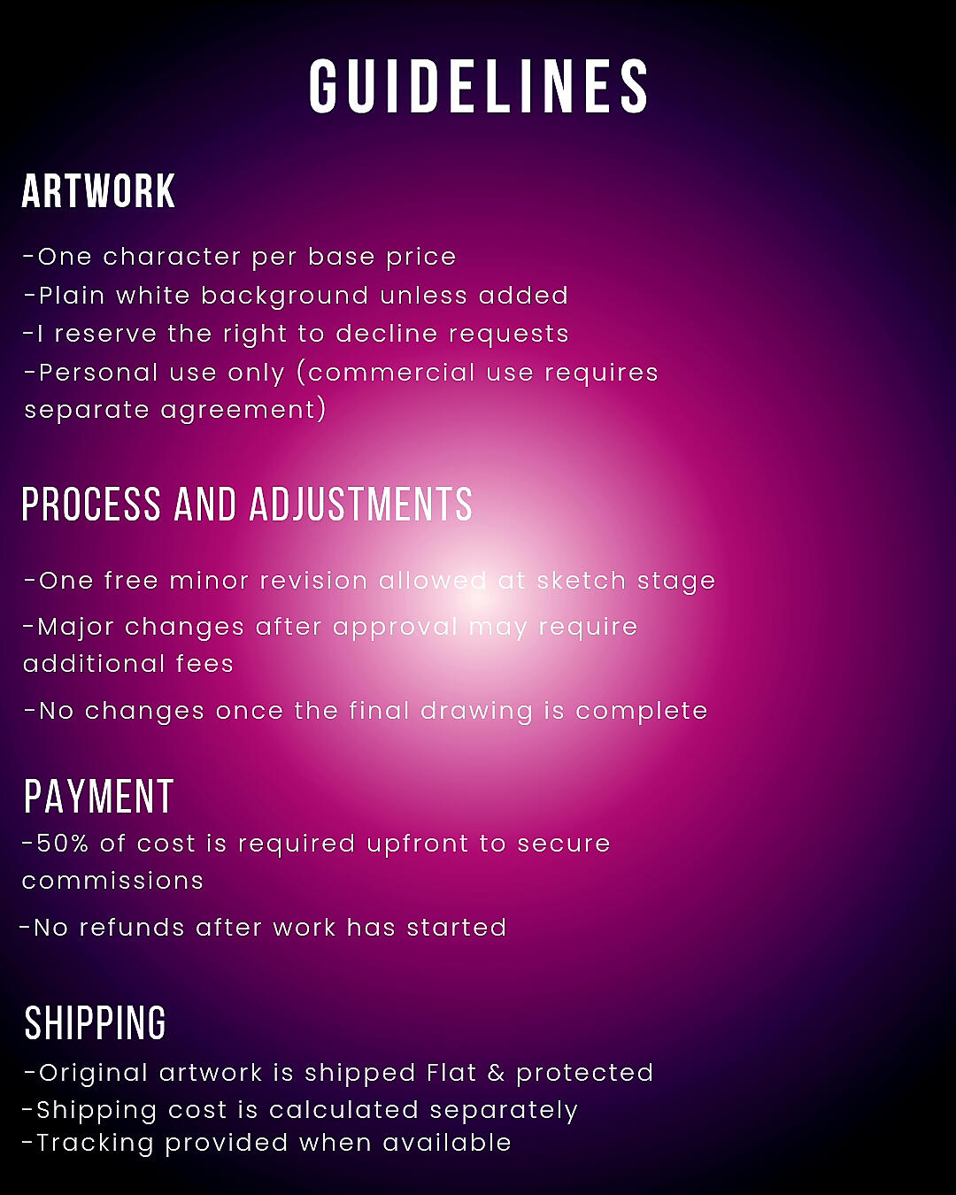 I specialize in stylized character art, portraits, and custom illustrations tailored to your vision. My goal is to deliver clean, detailed, and visually striking pieces while keeping the process smooth and collaborative. I provide updates throughout the commission to ensure you’re happy with the final result.